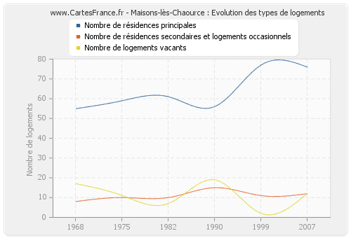 Les graphiques suivant reprennent l'historique du nombre et du type de logements de Maisons-lès-Chaource de 1968 à 2007. Le deuxième graphique est tracé en interpolation cubique. Ceci permet d'obtenir plus précisément le nombre de logement du village de Maisons-lès-Chaource les années ou aucun recensement n'a été effectué.