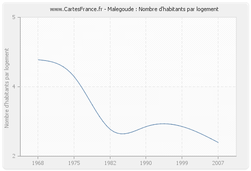 - Nombre d'habitants moyen par logement de Malegoude en 2007 : 2,30