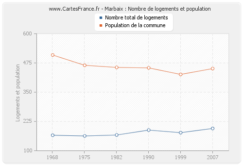 La population de Marbaix était de 451 habitants en 2007, 426 habitants en 1999, 454 habitants en 1990, 456 habitants en 1982, 465 habitants en 1975 et 509 habitants en 1968. Parallèlement, le nombre de logements de Marbaix était de 195 en 2007, 177 en 1999, 188 en 1990, 167 en 1982, 163 en 1975 et 166 en 1968.