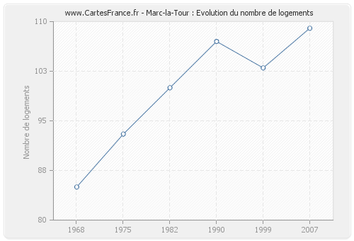 Le nombre de logements de Marc-la-Tour était de 109 en 2007, 103 en 1999, 107 en 1990, 100 en 1982, 93 en 1975 et 85 en 1968.