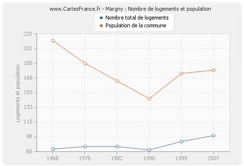 La population de Margny était de 177 habitants en 2007, 173 habitants en 1999, 143 habitants en 1990, 164 habitants en 1982, 185 habitants en 1975 et 212 habitants en 1968. Parallèlement, le nombre de logements de Margny était de 99 en 2007, 92 en 1999, 82 en 1990, 86 en 1982, 86 en 1975 et 83 en 1968.