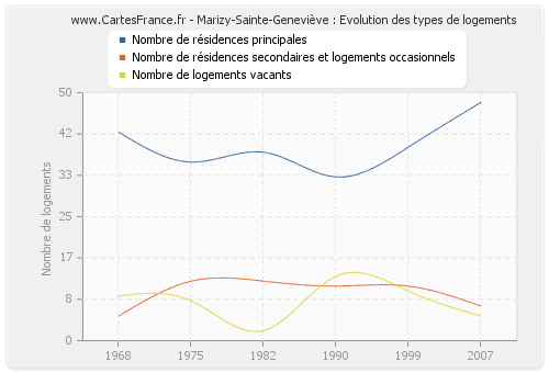 En 2007 les logements de Marizy-Sainte-Geneviève étaient composés de 48 résidences principales, 7 résidences secondaires ou occasionnels ainsi que 5 logements vacants.