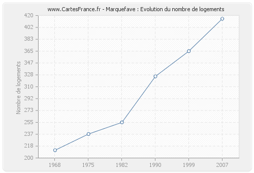 Le nombre de logements de Marquefave était de 415 en 2007, 365 en 1999, 326 en 1990, 255 en 1982, 237 en 1975 et 212 en 1968.