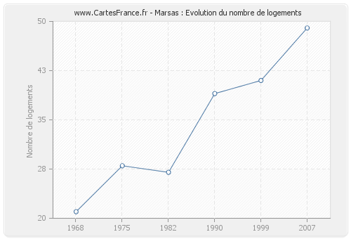 Le nombre de logements de Marsas était de 49 en 2007, 41 en 1999, 39 en 1990, 27 en 1982, 28 en 1975 et 21 en 1968.
