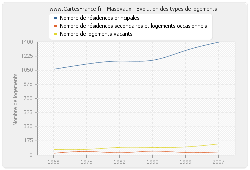 Les graphiques suivant reprennent l'historique du nombre et du type de logements de Masevaux de 1968 à 2007. Le deuxième graphique est tracé en interpolation cubique. Ceci permet d'obtenir plus précisément le nombre de logement de la ville de Masevaux les années ou aucun recensement n'a été effectué.