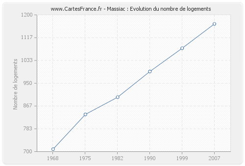 Le nombre de logements de Massiac était de 1 167 en 2007, 1 078 en 1999, 993 en 1990, 899 en 1982, 836 en 1975 et 709 en 1968.