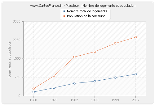 La population de Massieux était de 2 367 habitants en 2007, 2 119 habitants en 1999, 1 782 habitants en 1990, 1 568 habitants en 1982, 805 habitants en 1975 et 291 habitants en 1968. Parallèlement, le nombre de logements de Massieux était de 876 en 2007, 739 en 1999, 589 en 1990, 506 en 1982, 327 en 1975 et 159 en 1968.