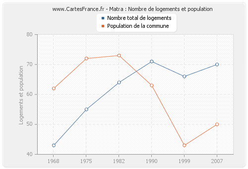 La population de Matra était de 50 habitants en 2007, 43 habitants en 1999, 63 habitants en 1990, 73 habitants en 1982, 72 habitants en 1975 et 62 habitants en 1968. Parallèlement, le nombre de logements de Matra était de 70 en 2007, 66 en 1999, 71 en 1990, 64 en 1982, 55 en 1975 et 43 en 1968.