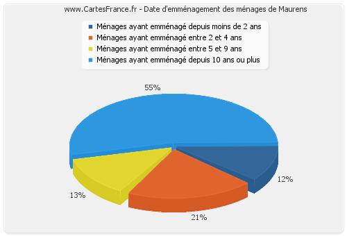 - Nombre de ménages de Maurens ayant emménagé depuis 10 ans ou plus : 42