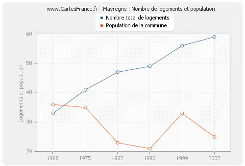 La population de Mayrègne était de 25 habitants en 2007, 33 habitants en 1999, 21 habitants en 1990, 23 habitants en 1982, 35 habitants en 1975 et 36 habitants en 1968. Parallèlement, le nombre de logements de Mayrègne était de 59 en 2007, 56 en 1999, 49 en 1990, 47 en 1982, 41 en 1975 et 33 en 1968.