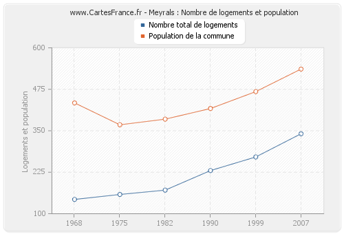 La population de Meyrals était de 536 habitants en 2007, 468 habitants en 1999, 417 habitants en 1990, 385 habitants en 1982, 368 habitants en 1975 et 434 habitants en 1968. Parallèlement, le nombre de logements de Meyrals était de 341 en 2007, 271 en 1999, 230 en 1990, 171 en 1982, 158 en 1975 et 143 en 1968.
