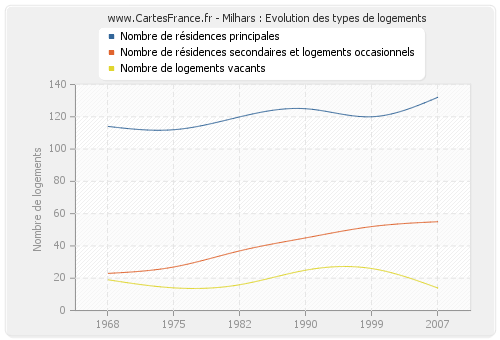 Les graphiques suivant reprennent l'historique du nombre et du type de logements de Milhars de 1968 à 2007. Le deuxième graphique est tracé en interpolation cubique. Ceci permet d'obtenir plus précisément le nombre de logement du village de Milhars les années ou aucun recensement n'a été effectué.