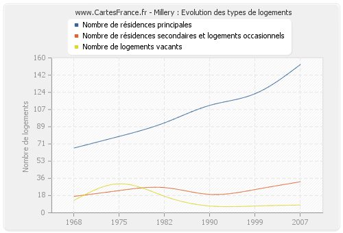 En 2007 les logements de Millery étaient composés de 153 résidences principales, 32 résidences secondaires ou occasionnels ainsi que 8 logements vacants.