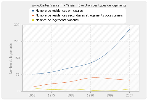 Les graphiques suivant reprennent l'historique du nombre et du type de logements de Minzier de 1968 à 2007. Le deuxième graphique est tracé en interpolation cubique. Ceci permet d'obtenir plus précisément le nombre de logement du village de Minzier les années ou aucun recensement n'a été effectué.