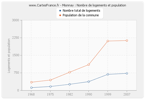 La population de Mionnay était de 2 132 habitants en 2007, 2 111 habitants en 1999, 1 103 habitants en 1990, 778 habitants en 1982, 444 habitants en 1975 et 350 habitants en 1968. Parallèlement, le nombre de logements de Mionnay était de 729 en 2007, 686 en 1999, 375 en 1990, 261 en 1982, 168 en 1975 et 119 en 1968.