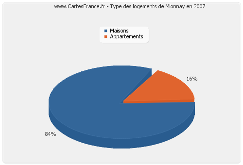 En 2007 les logements de Mionnay étaient composés de 700 résidences principales, 14 résidences secondaires ou occasionnels ainsi que 14 logements vacants.
