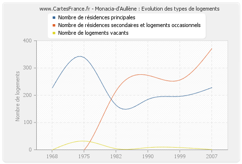 Les graphiques suivant reprennent l'historique du nombre et du type de logements de Monacia-d'Aullène de 1968 à 2007. Le deuxième graphique est tracé en interpolation cubique. Ceci permet d'obtenir plus précisément le nombre de logement du village de Monacia-d'Aullène les années ou aucun recensement n'a été effectué.