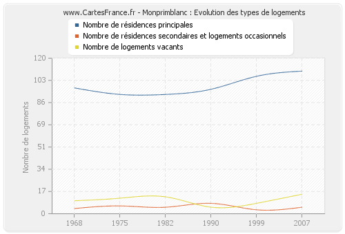 En 2007 les logements de Monprimblanc étaient composés de 110 résidences principales, 5 résidences secondaires ou occasionnels ainsi que 15 logements vacants.