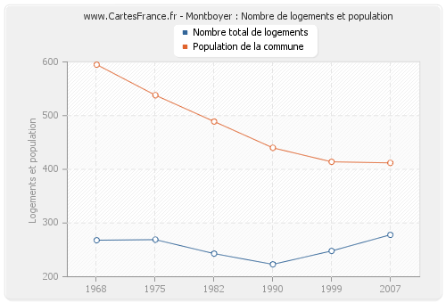 La population de Montboyer était de 412 habitants en 2007, 414 habitants en 1999, 440 habitants en 1990, 489 habitants en 1982, 538 habitants en 1975 et 595 habitants en 1968. Parallèlement, le nombre de logements de Montboyer était de 278 en 2007, 248 en 1999, 223 en 1990, 243 en 1982, 269 en 1975 et 268 en 1968.