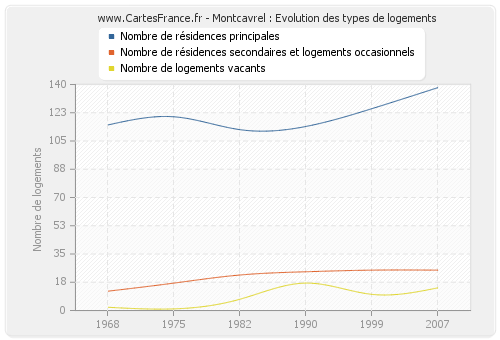 En 2007 les logements de Montcavrel étaient composés de 138 résidences principales, 25 résidences secondaires ou occasionnels ainsi que 14 logements vacants.