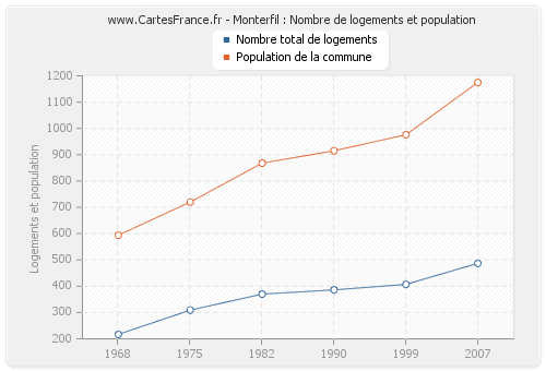 La population de Monterfil était de 1 175 habitants en 2007, 976 habitants en 1999, 915 habitants en 1990, 868 habitants en 1982, 720 habitants en 1975 et 594 habitants en 1968. Parallèlement, le nombre de logements de Monterfil était de 487 en 2007, 407 en 1999, 386 en 1990, 370 en 1982, 309 en 1975 et 217 en 1968.