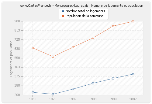 La population de Montesquieu-Lauragais était de 899 habitants en 2007, 854 habitants en 1999, 742 habitants en 1990, 654 habitants en 1982, 564 habitants en 1975 et 646 habitants en 1968. Parallèlement, le nombre de logements de Montesquieu-Lauragais était de 398 en 2007, 357 en 1999, 311 en 1990, 256 en 1982, 207 en 1975 et 225 en 1968.