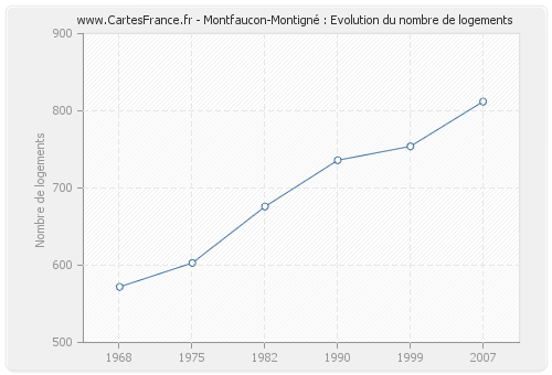 Historique du nombre de logements de Montfaucon-Montigné de 1968 à 2007 :