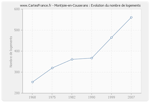 Le nombre de logements de Montjoie-en-Couserans était de 561 en 2007, 465 en 1999, 367 en 1990, 361 en 1982, 320 en 1975 et 253 en 1968.