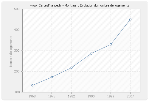 Historique du nombre de logements de Montlaur de 1968 à 2007 :