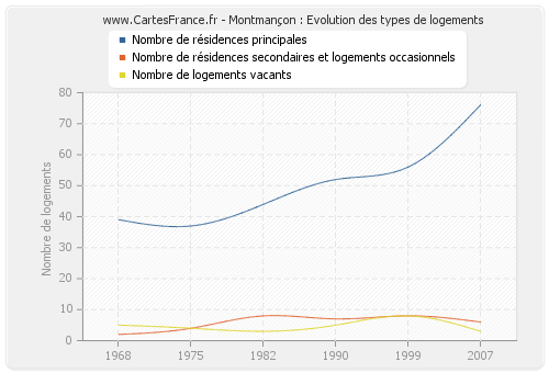 En 2007 les logements de Montmançon étaient composés de 76 résidences principales, 6 résidences secondaires ou occasionnels ainsi que 3 logements vacants.