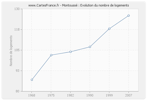 Le nombre de logements de Montoussé était de 126 en 2007, 118 en 1999, 107 en 1990, 104 en 1982, 102 en 1975 et 87 en 1968.