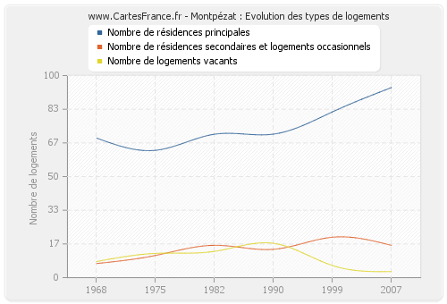 Les graphiques suivant reprennent l'historique du nombre et du type de logements de Montpézat de 1968 à 2007. Le deuxième graphique est tracé en interpolation cubique. Ceci permet d'obtenir plus précisément le nombre de logement du village de Montpézat les années ou aucun recensement n'a été effectué.