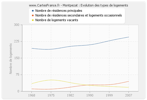 Historique du nombre de logements de Montpezat de 1968 à 2007 :