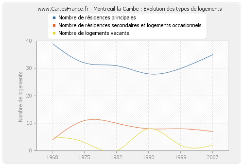 Les graphiques suivant reprennent l'historique du nombre et du type de logements de Montreuil-la-Cambe de 1968 à 2007. Le deuxième graphique est tracé en interpolation cubique. Ceci permet d'obtenir plus précisément le nombre de logement du village de Montreuil-la-Cambe les années ou aucun recensement n'a été effectué.