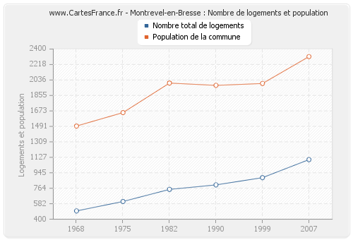 La population de Montrevel-en-Bresse était de 2 311 habitants en 2007, 1 995 habitants en 1999, 1 973 habitants en 1990, 2 000 habitants en 1982, 1 653 habitants en 1975 et 1 495 habitants en 1968. Parallèlement, le nombre de logements de Montrevel-en-Bresse était de 1 100 en 2007, 888 en 1999, 803 en 1990, 750 en 1982, 608 en 1975 et 497 en 1968.