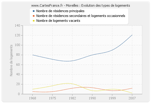 - Nombre de résidences principales de Moreilles en 2007 : 121