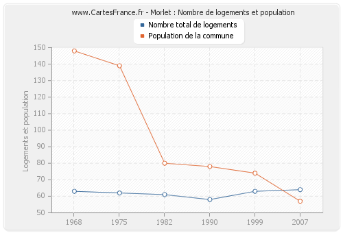 La population de Morlet était de 57 habitants en 2007, 74 habitants en 1999, 78 habitants en 1990, 80 habitants en 1982, 139 habitants en 1975 et 148 habitants en 1968. Parallèlement, le nombre de logements de Morlet était de 64 en 2007, 63 en 1999, 58 en 1990, 61 en 1982, 62 en 1975 et 63 en 1968.