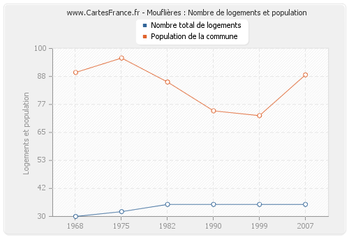 La population de Mouflières était de 89 habitants en 2007, 72 habitants en 1999, 74 habitants en 1990, 86 habitants en 1982, 96 habitants en 1975 et 90 habitants en 1968. Parallèlement, le nombre de logements de Mouflières était de 35 en 2007, 35 en 1999, 35 en 1990, 35 en 1982, 32 en 1975 et 30 en 1968.