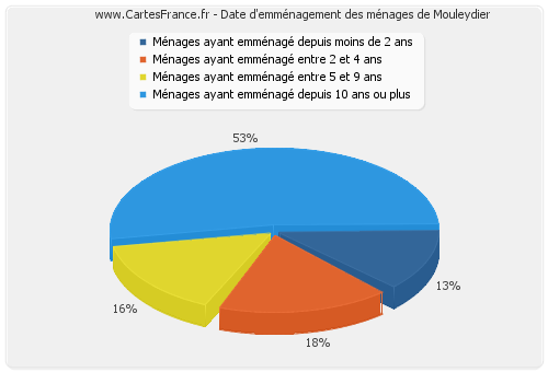 - Nombre de ménages de Mouleydier ayant emménagé depuis 10 ans ou plus : 254