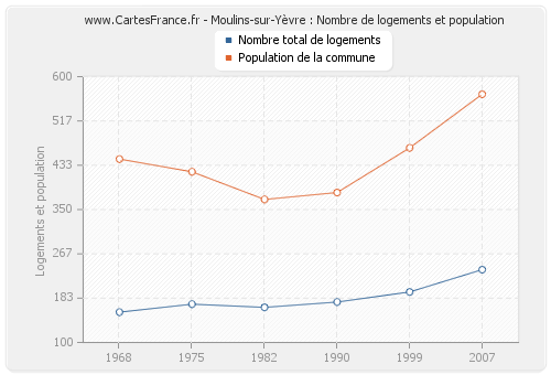 La population de Moulins-sur-Yèvre était de 567 habitants en 2007, 466 habitants en 1999, 382 habitants en 1990, 369 habitants en 1982, 421 habitants en 1975 et 445 habitants en 1968. Parallèlement, le nombre de logements de Moulins-sur-Yèvre était de 237 en 2007, 195 en 1999, 176 en 1990, 166 en 1982, 172 en 1975 et 157 en 1968.