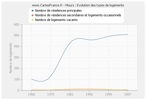 Les graphiques suivant reprennent l'historique du nombre et du type de logements de Mours de 1968 à 2007. Le deuxième graphique est tracé en interpolation cubique. Ceci permet d'obtenir plus précisément le nombre de logement du village de Mours les années ou aucun recensement n'a été effectué.