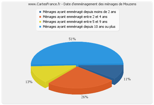 - Nombre de ménages de Mouzens ayant emménagé depuis 10 ans ou plus : 24