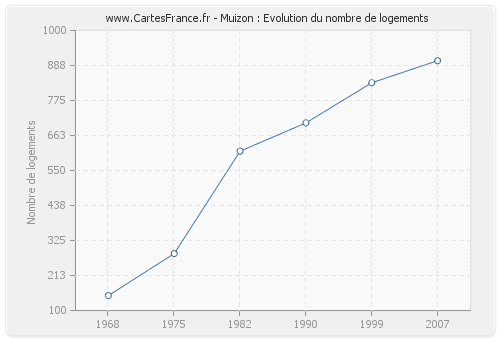 Le nombre de logements de Muizon était de 903 en 2007, 832 en 1999, 703 en 1990, 612 en 1982, 283 en 1975 et 148 en 1968.