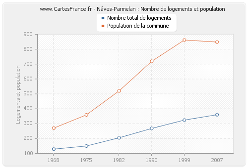 La population de Nâves-Parmelan était de 848 habitants en 2007, 862 habitants en 1999, 719 habitants en 1990, 520 habitants en 1982, 359 habitants en 1975 et 270 habitants en 1968. Parallèlement, le nombre de logements de Nâves-Parmelan était de 360 en 2007, 324 en 1999, 268 en 1990, 205 en 1982, 150 en 1975 et 129 en 1968.