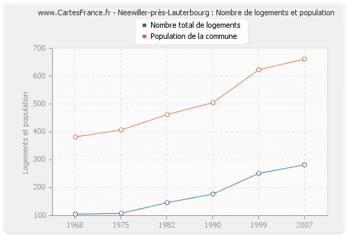 La population de Neewiller-près-Lauterbourg était de 661 habitants en 2007, 623 habitants en 1999, 505 habitants en 1990, 462 habitants en 1982, 407 habitants en 1975 et 382 habitants en 1968. Parallèlement, le nombre de logements de Neewiller-près-Lauterbourg était de 282 en 2007, 251 en 1999, 177 en 1990, 146 en 1982, 108 en 1975 et 105 en 1968.