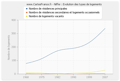 Les graphiques suivant reprennent l'historique du nombre et du type de logements de Niffer de 1968 à 2007. Le deuxième graphique est tracé en interpolation cubique. Ceci permet d'obtenir plus précisément le nombre de logement du village de Niffer les années ou aucun recensement n'a été effectué.