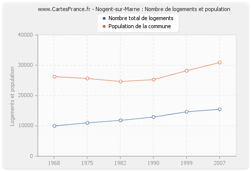 La population de Nogent-sur-Marne était de 30 912 habitants en 2007, 28 194 habitants en 1999, 25 248 habitants en 1990, 24 630 habitants en 1982, 25 634 habitants en 1975 et 26 238 habitants en 1968. Parallèlement, le nombre de logements de Nogent-sur-Marne était de 15 467 en 2007, 14 651 en 1999, 12 912 en 1990, 11 810 en 1982, 11 001 en 1975 et 9 992 en 1968.