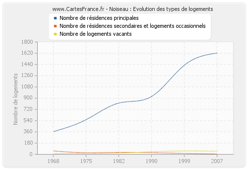 Les graphiques suivant reprennent l'historique du nombre et du type de logements de Noiseau de 1968 à 2007. Le deuxième graphique est tracé en interpolation cubique. Ceci permet d'obtenir plus précisément le nombre de logement de la ville de Noiseau les années ou aucun recensement n'a été effectué.