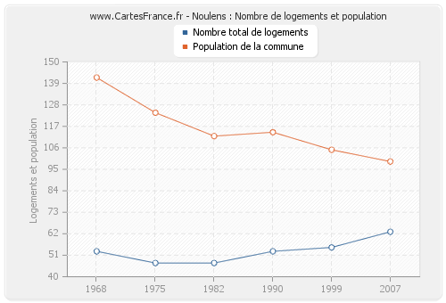 La population de Noulens était de 99 habitants en 2007, 105 habitants en 1999, 114 habitants en 1990, 112 habitants en 1982, 124 habitants en 1975 et 142 habitants en 1968. Parallèlement, le nombre de logements de Noulens était de 63 en 2007, 55 en 1999, 53 en 1990, 47 en 1982, 47 en 1975 et 53 en 1968.