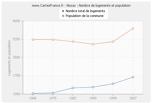 La population de Nozay était de 3 696 habitants en 2007, 3 156 habitants en 1999, 3 050 habitants en 1990, 3 158 habitants en 1982, 3 237 habitants en 1975 et 3 242 habitants en 1968. Parallèlement, le nombre de logements de Nozay était de 1 695 en 2007, 1 421 en 1999, 1 286 en 1990, 1 253 en 1982, 1 049 en 1975 et 1 026 en 1968.